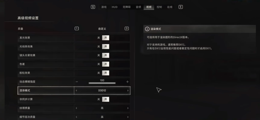 在画面设置方面,首先关注渲染模式。玩家可将渲染模式选择为 DXE2,对于纹理质量,大家可以根据自身电脑的硬件配置进行适当调高。如果配置较高将纹理质量调至较高水平,能让游戏画面更加细腻逼真,带来更出色的视觉体验。