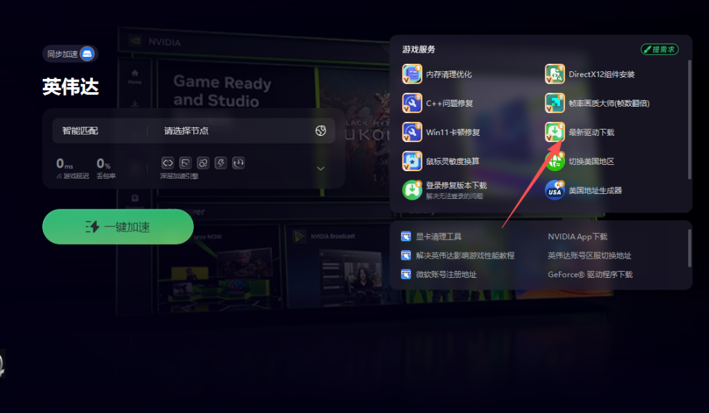 对于 N 卡用户还可以关注英伟达最新驱动的智能补帧技术。部分玩家可能不清楚在哪里下载最新驱动,此时同样可以使用奇游加速工具搜索英伟达,点击最新驱动下载选项。