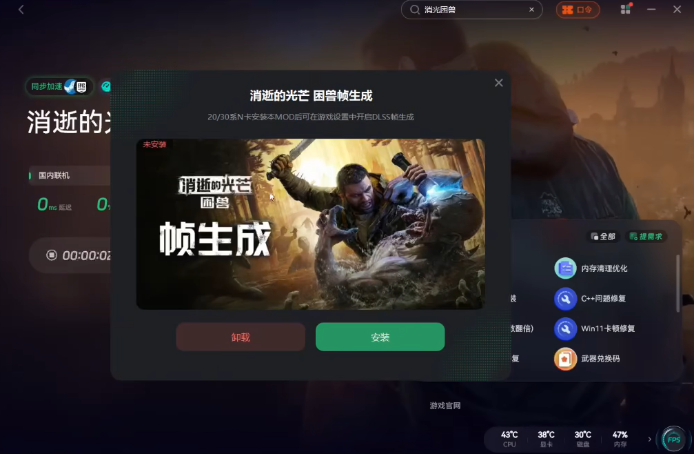 然后使用奇游右侧的帧生成功能,一键安装帧生成所需的组件,安装完成后就能尝试开启帧生成了。