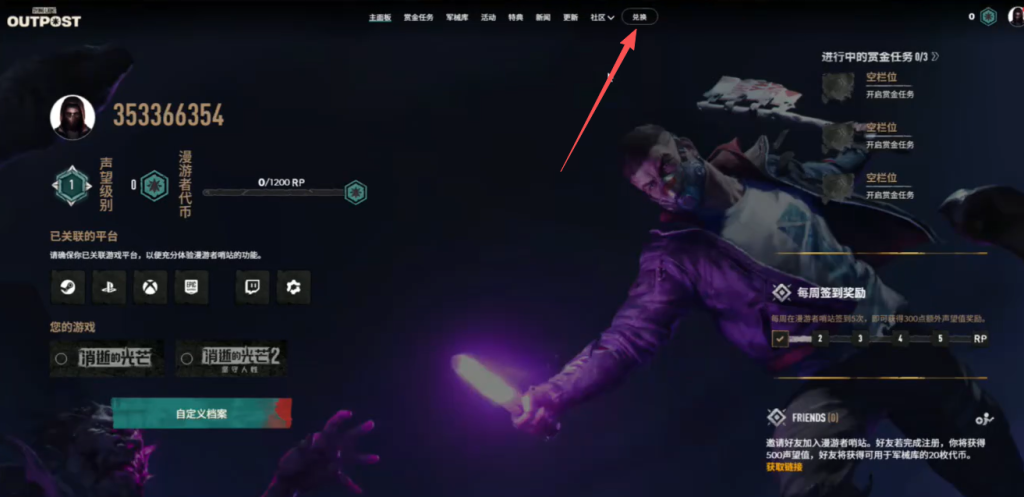 绑定完成后先在页面下方领取道具坑壁纸奖励。领取完毕后点击页面上方的兑换选项。