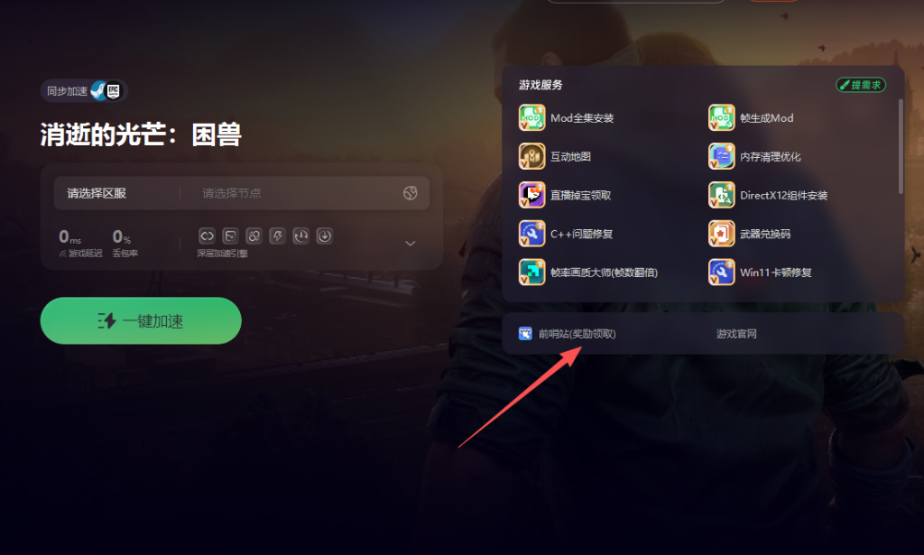 首先玩家们需要打开漫游者哨站官网,不过直接裸连该官网,常常会出现各种报错、无法打开的情况。可以使用奇游加速工具对消逝的光芒困兽点击一键加速,这样就能顺利打开官网了。