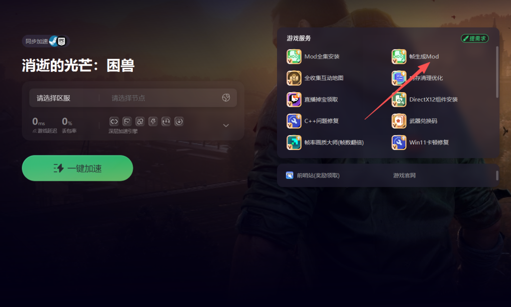 完成网络优化后还可以进一步开启游戏内的帧生成功能。在奇游加速工具界面右侧,找到帧生成选项点击安装。