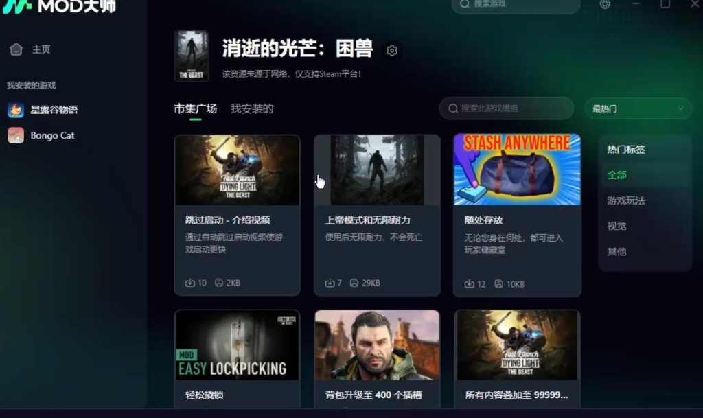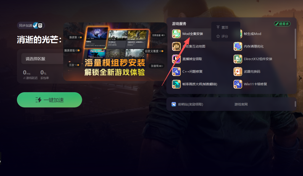 安装过程异常简便,玩家只需打开奇游加速工具,在界面右侧找到MOD全局安装选项,点击进入后,即可从列表中挑选自己心仪的MOD进行一键安装。