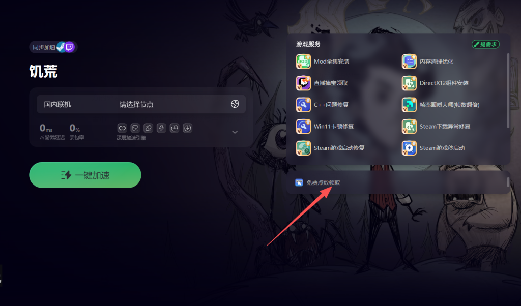 首先玩家需要准备一个奇游加速工具来优化饥荒的网络连接。加速成功后点击界面下方的免费点数入口,使用支持的账号直接登录即可领取奖励。