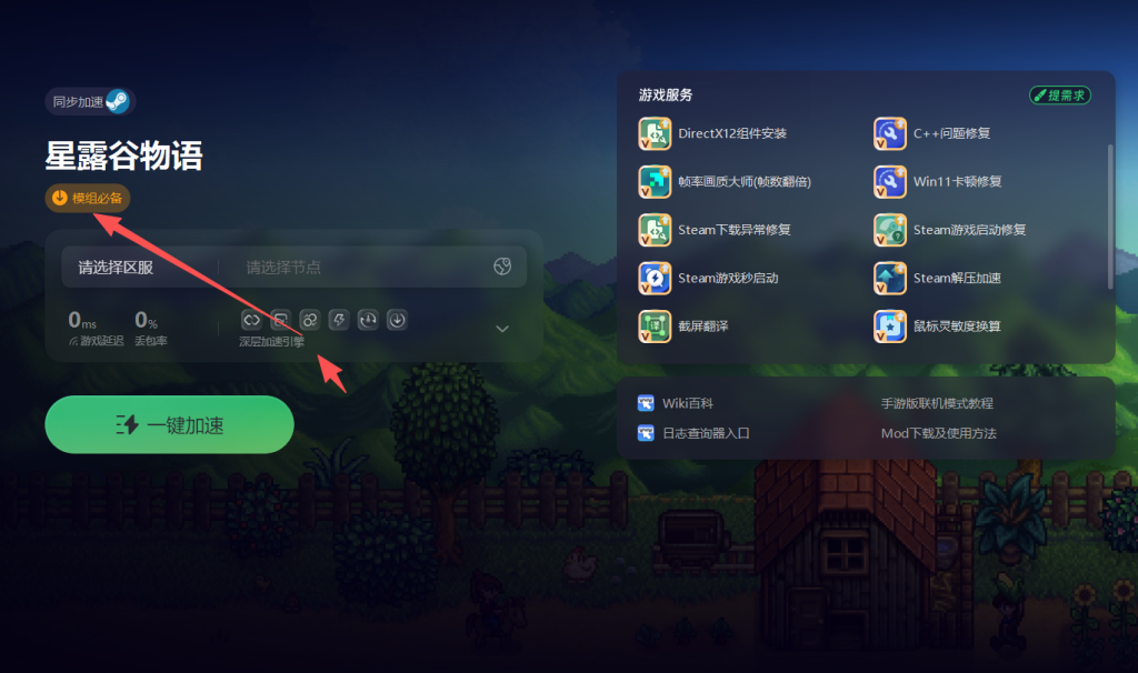 加速成功后点击游戏名下方的模组必备选项,下载所需的必备文件。下载完成后,文件会自动打开安装教程页面。