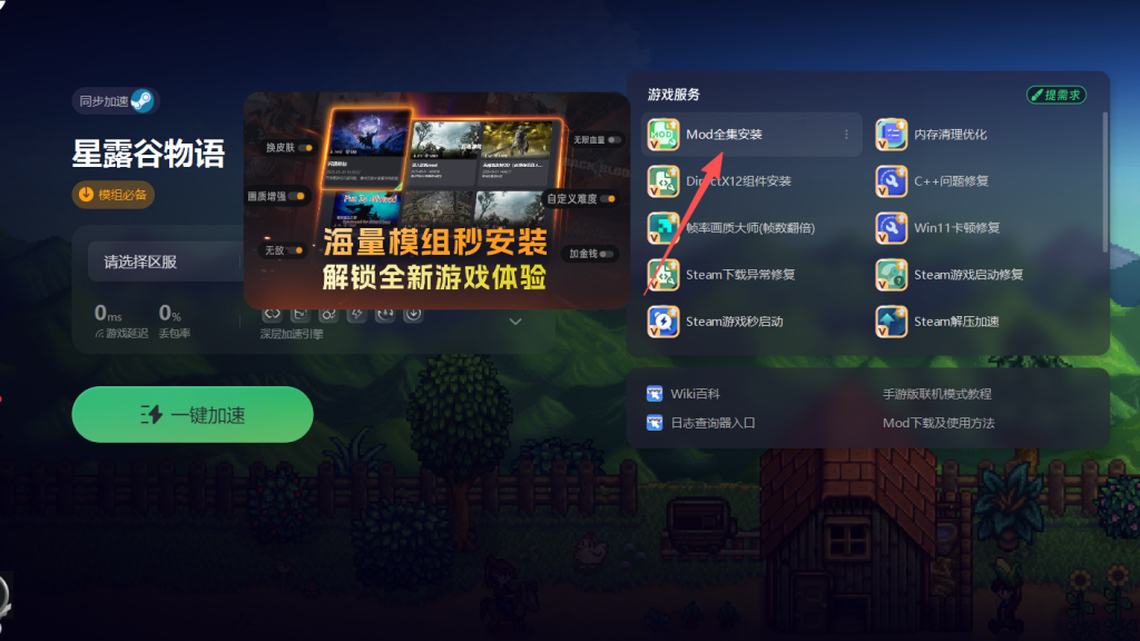完成上述步骤后返回奇游加速工具,点击右侧的MOD合集选项。在MOD列表中,找到宝可梦MOD并点击安装。