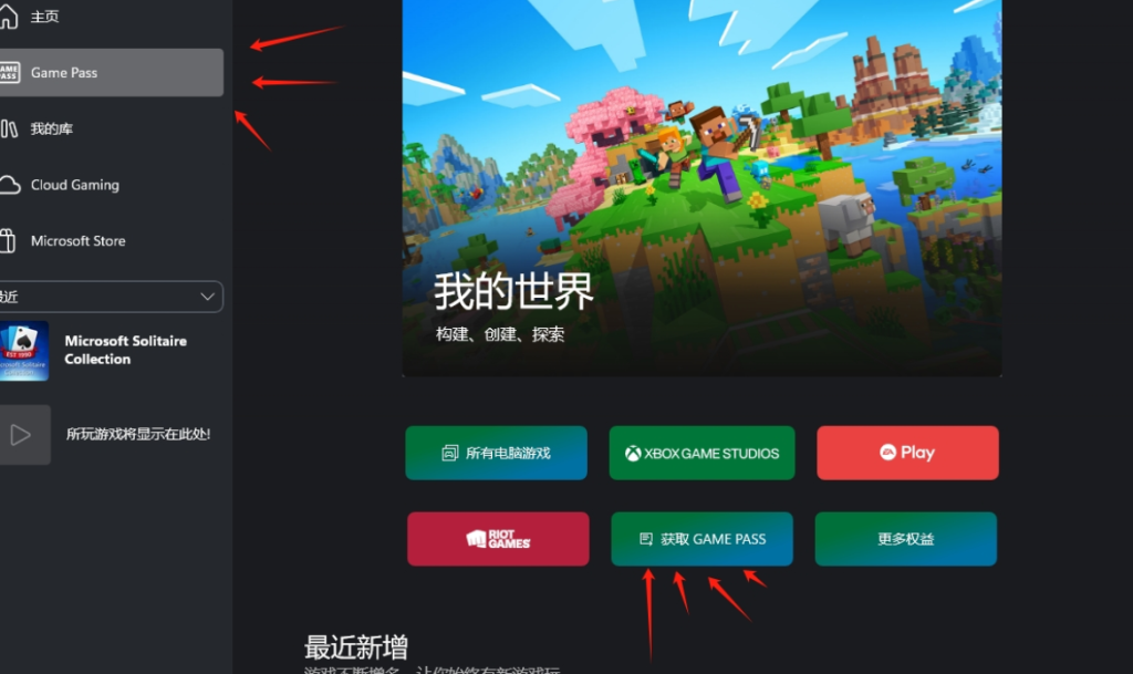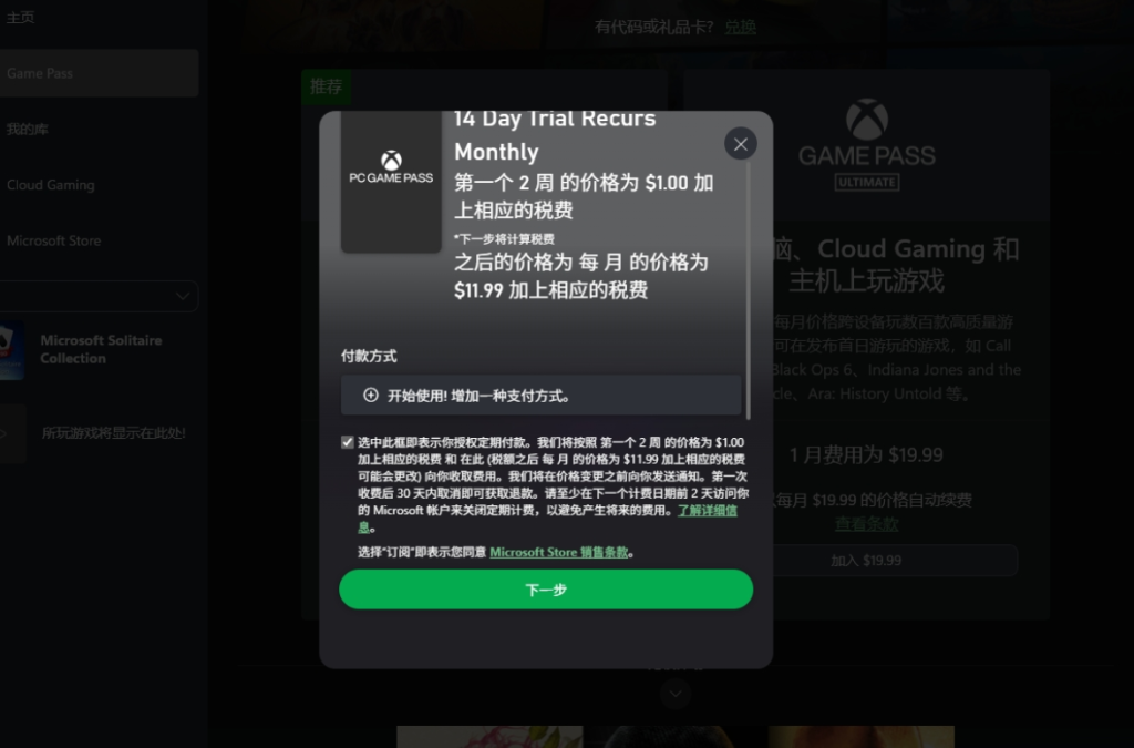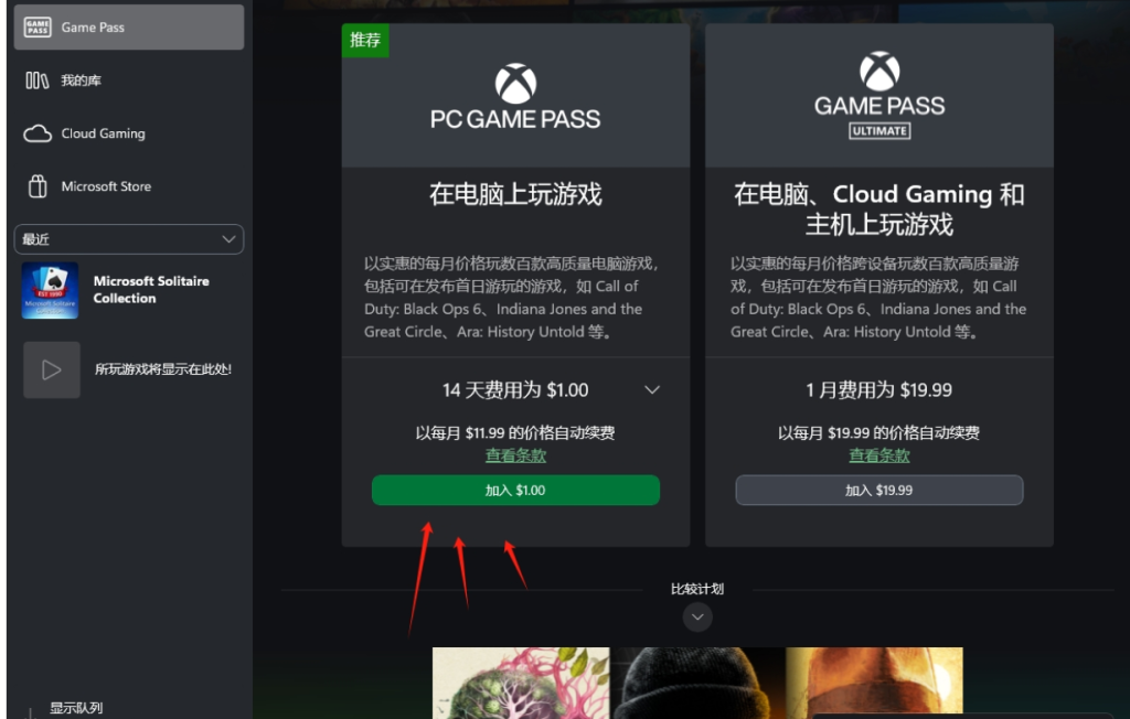 完成注册进入Xbox,点击“gamepass”获取相关服务,再点击1美元加入选项,进入下一步。