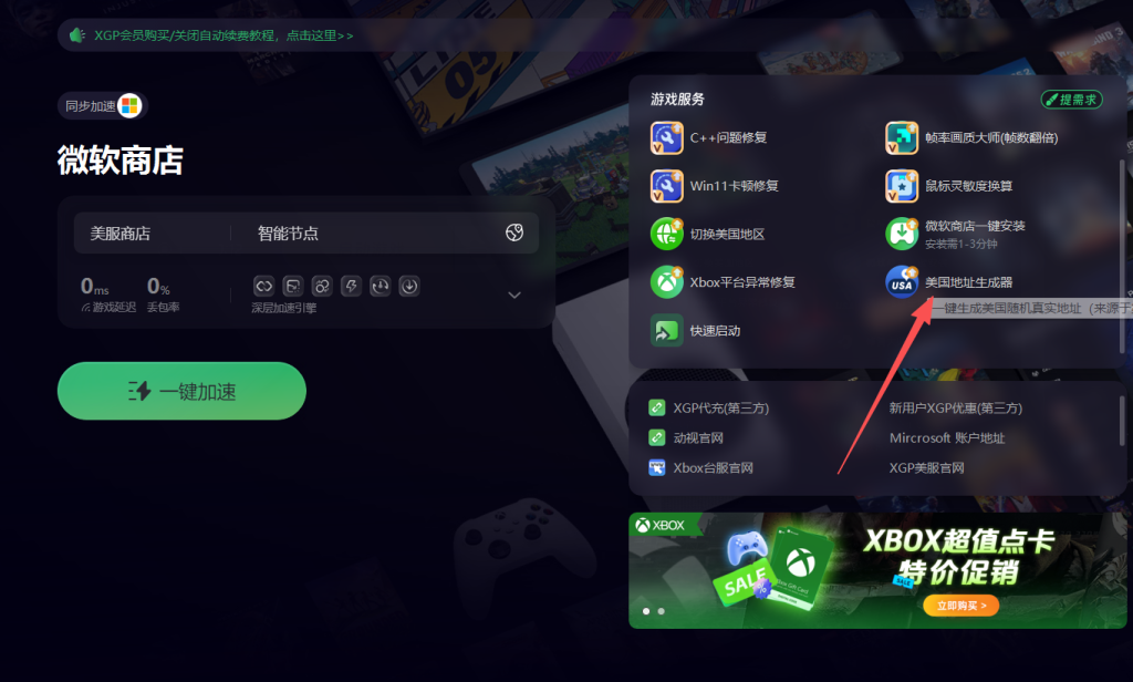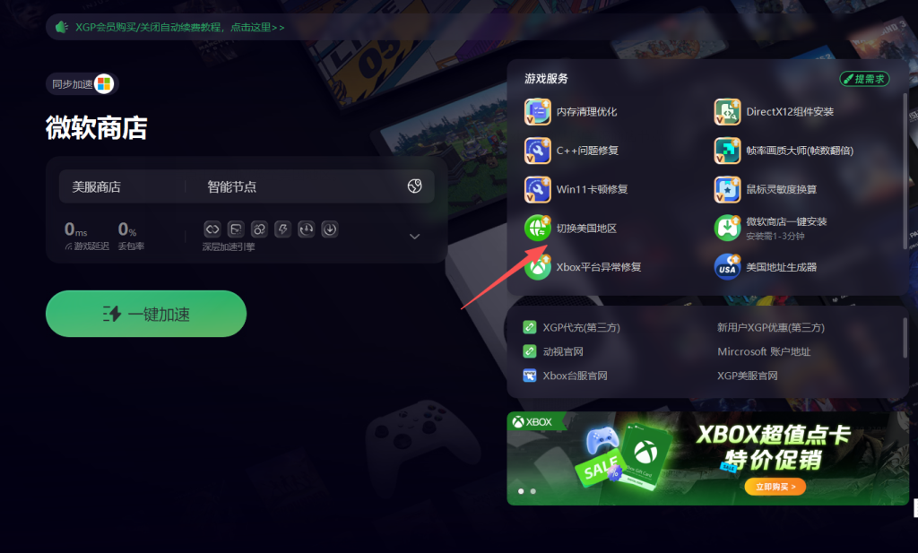 首先要注册一个全新的美区账号,使用奇游加速工具,加速xbox商店的美服商店节点,然后点击右侧切换至美国地区。