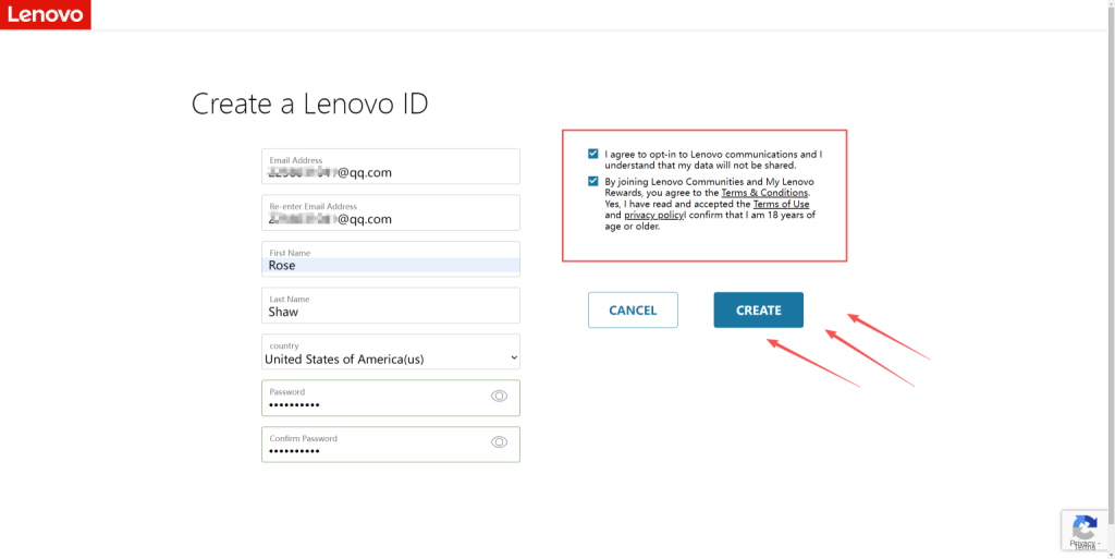 在注册过程中需要填写邮箱、密码、用户名等必要信息,并同意右侧的两个条款,最后点击蓝色的create按钮完成注册。