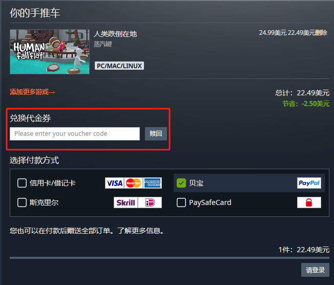 之后将游戏加入购物车并使用优惠券下单获得Steam key。最后前往Steam平台激活该key,领取人类一败涂地。