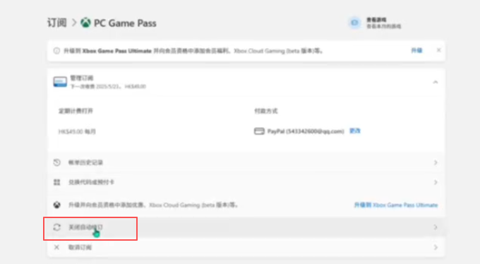 记得付完之后关掉自动续费,在账户管理里找到Game Pass选项,选择关闭自动续费即可。
