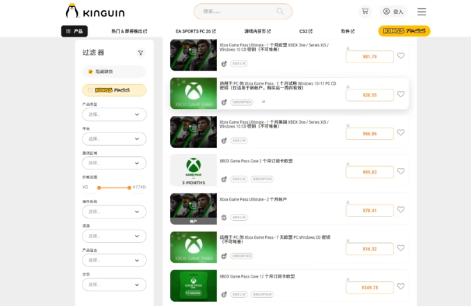 第一种方法是在第三方平台购买CDK兑换码。比如可以上kinguin官网,先把货币切换成人民币,然后搜索“Xbox Game Pass”,按价格从低到高排序,选一个最便宜的进入购买页面。