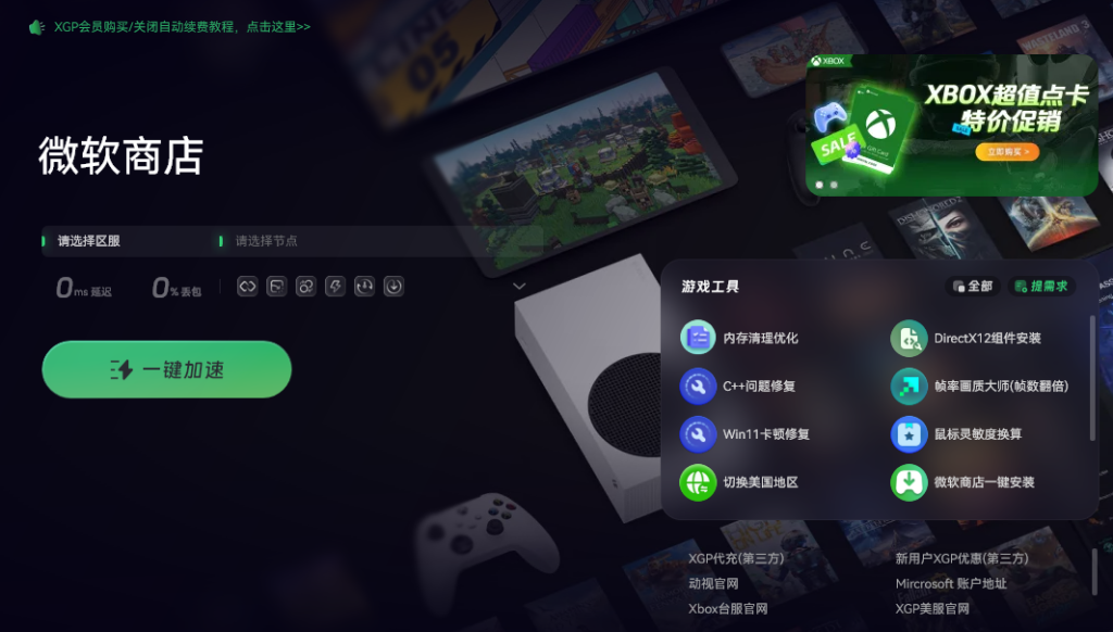 第二种方法是利用XGP美服的新用户优惠。使用奇游加速工具,搜索“微软商店”并选择美国节点进行加速。