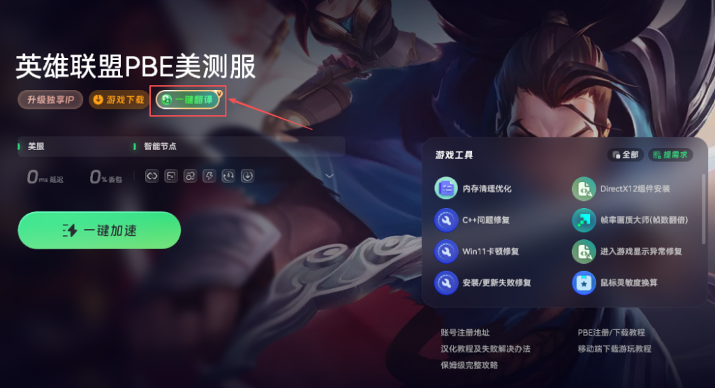 万一进去发现是英文界面,先退出游戏,在奇游的美测服加速页面找到“一键翻译”功能,点击后再重新启动游戏,界面就变成中文了。