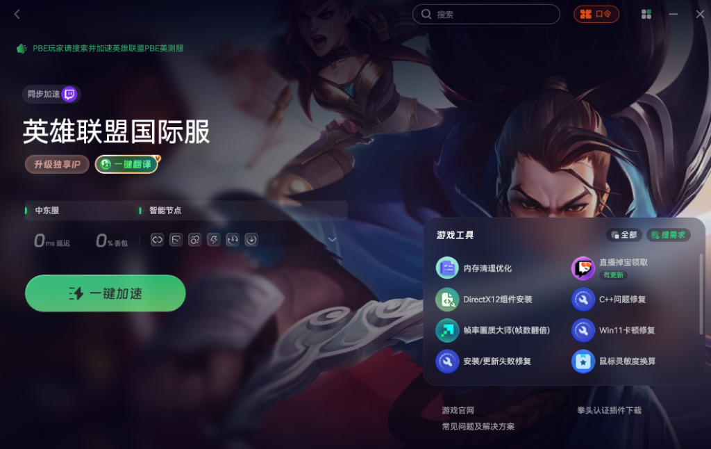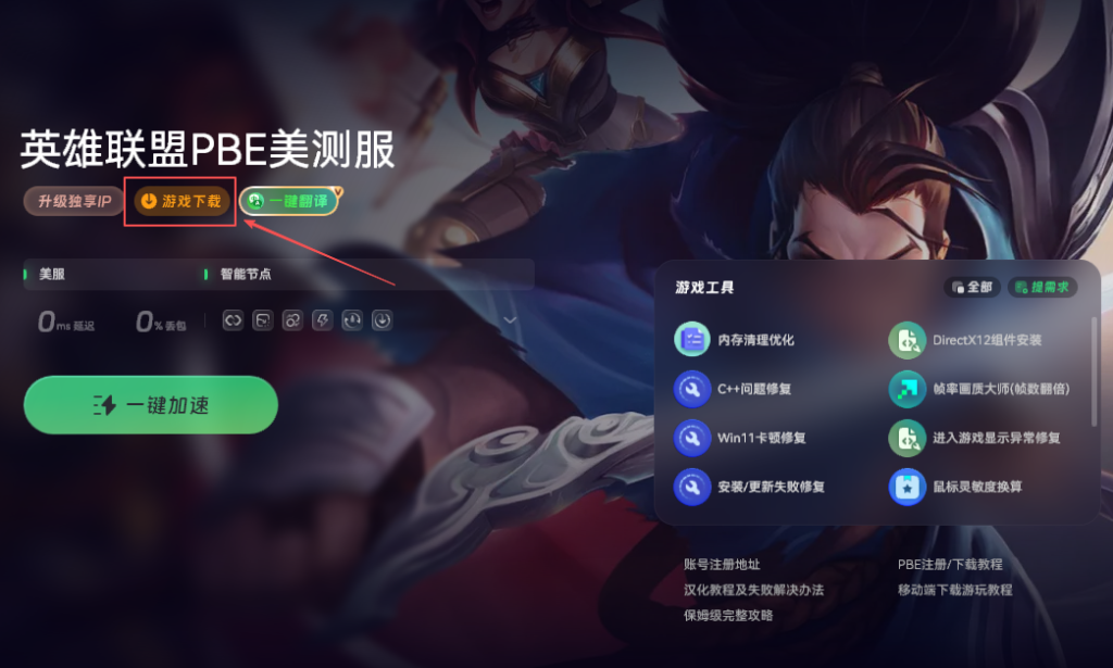 在奇游里搜索“PBE美测服”进行加速。加速页面一般有“游戏下载”的按钮,点一下就能一键下载并安装拳头官方的客户端。