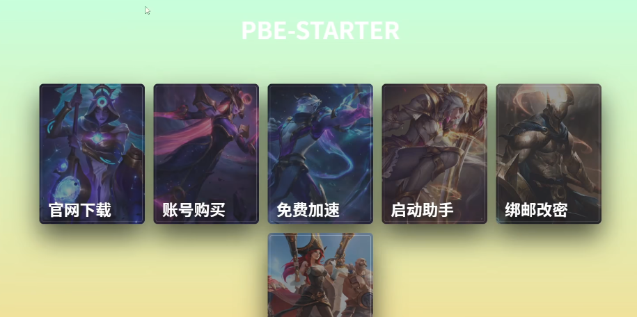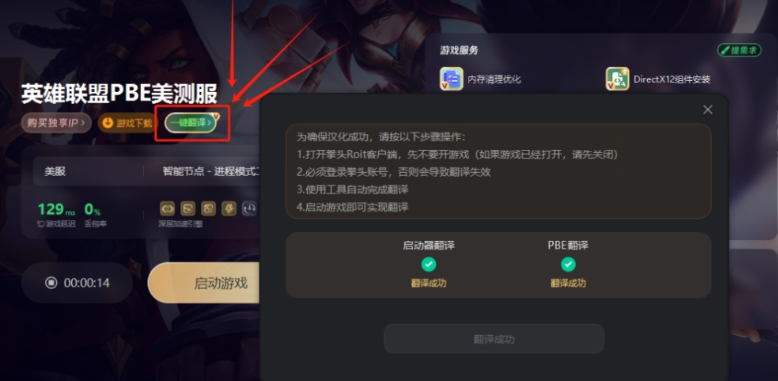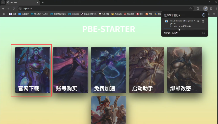 登录之后,在游戏列表里找到PBE美测服的入口,点击下载游戏内容(如果有更新的话),完成后就能启动游戏了。