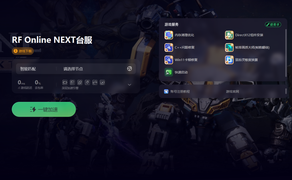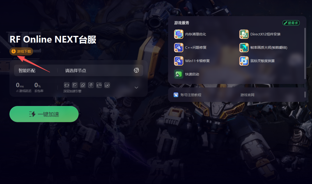 在开始下载注册之前需要借助专业的加速工具来优化网络环境。打开奇游加速工具,搜索RF Online Next台服,点击一键加速,为后续的下载和注册流程提供稳定的网络支持。