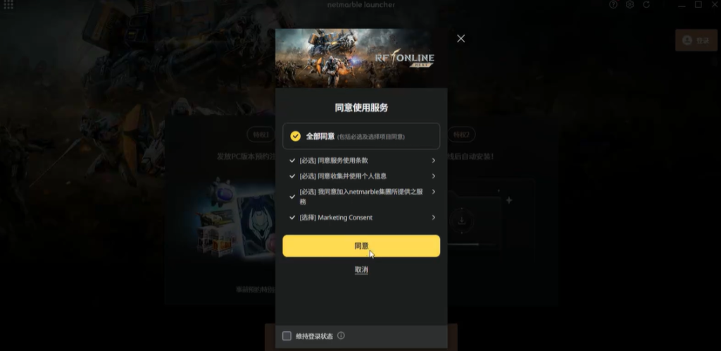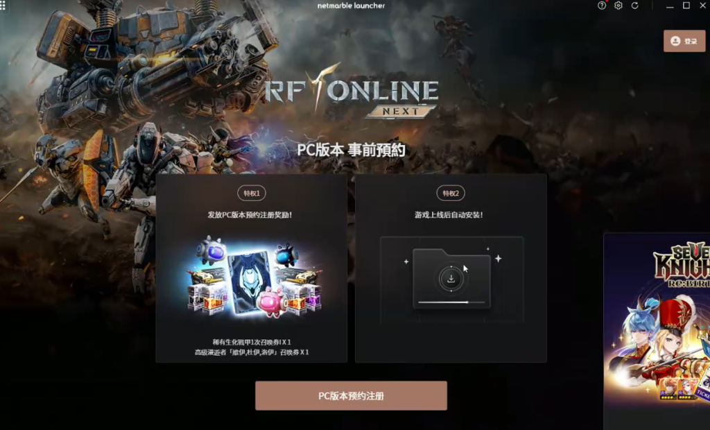安装好客户端后打开看到RF Online NextPC版本的事前预约界面,点击PC版本预约注册。接着选择netmarble id登录,再点击注册会员,进入注册页面。