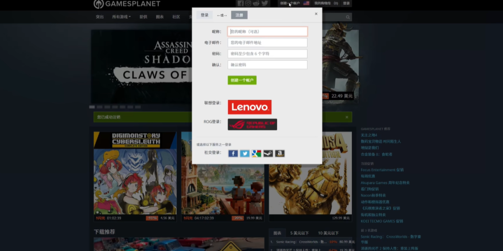 接着会进入新界面,点击上方的创建账号,使用刚注册的联想账号完成注册。然后搜索human fall flag,进入页面后将其添加至购物车。
