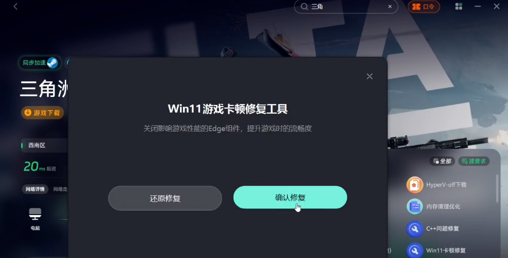 在玩游戏时系统中一些隐藏的性能组件可能会对游戏运行产生干扰,进而引发闪退蓝屏、卡顿掉帧等问题。奇游加速工具提供了 win11 修复功能,点击该功能后,程序会自动运行并检测系统中的性能组件,为游戏的稳定运行创造更好的条件。