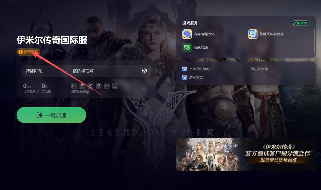 成功获取测试资格后就等着测试开启后下载游戏客户端了。当测试正式开启,游戏官方会第一时间开放一键下载功能。玩家只需在奇游加速工具中找到游戏下载的相关入口,点击此处的游戏下载按钮,即可直接下载尤弥尔传奇国际服的游戏客户端,整个过程简单便捷。