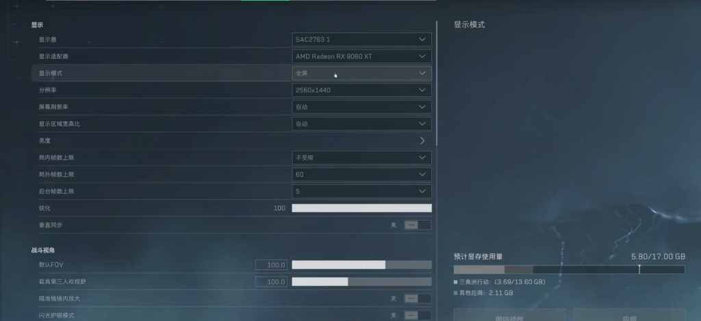 进入设置界面后,将显示模式调整为全屏,分辨率设为屏幕支持的最高值,刷新率同步调至最高。局内外帧数限制可解除,锐化程度根据硬件配置调整至50~70区间。垂直同步需关闭以减少延迟,默认视设为100。