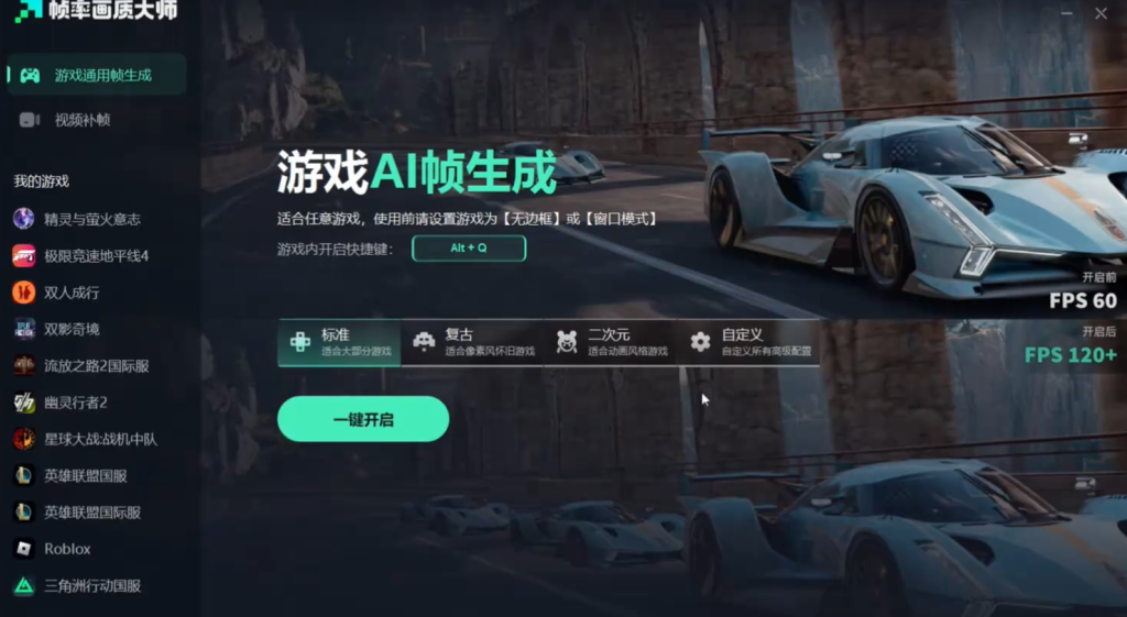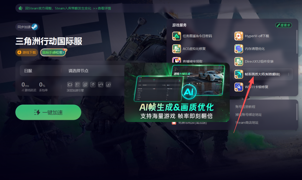 完成基础设置后使用奇游加速工具进一步优化。点击右侧的帧率/画质大师功能入口。在游戏通用帧生成选项中,点击一键开启实现AI自动补帧,