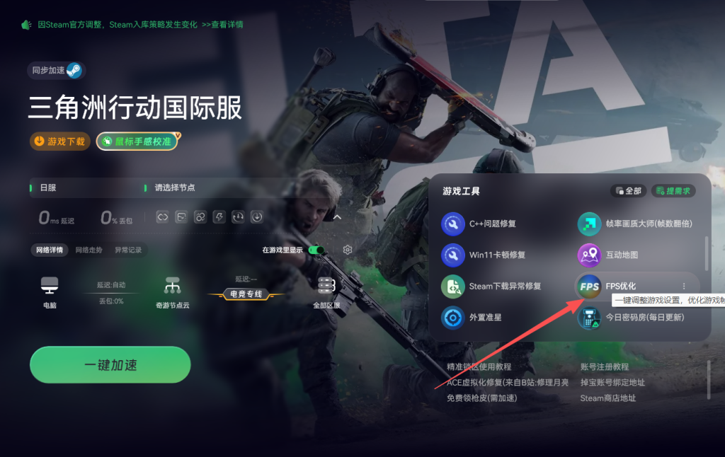 画面设置方面针对不同硬件配置,玩家可通过奇游加速工具实现一键优化。启动奇游后搜索三角洲行动,点击右侧的FPS优化按钮。工具将根据电脑配置自动生成最佳画面参数,涵盖分辨率、纹理质量、阴影效果等关键选项,避免手动调试的繁琐与误差。