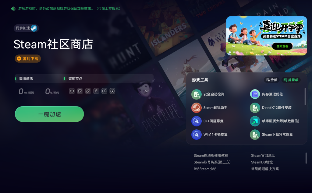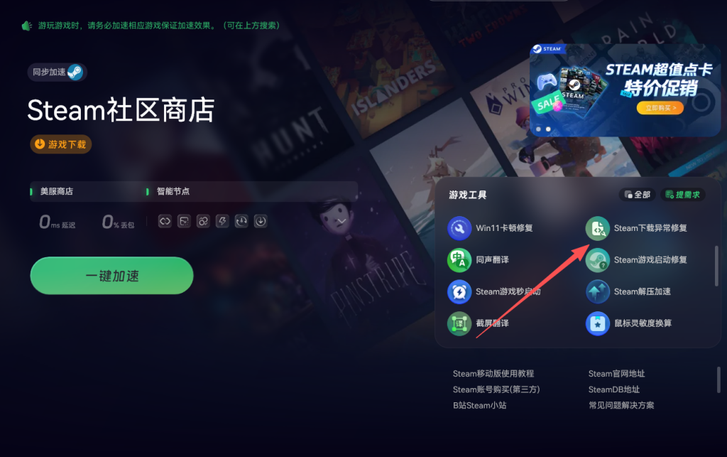 除了优化网络外,玩家还可以使用奇游加速工具中提供的Steam下载异常修复工具。专门针对Steam下载过程中可能出现的问题进行修复,通过智能检测和修复下载链路中的异常,帮助玩家快速恢复下载功能,解决下载内容不可用的问题。