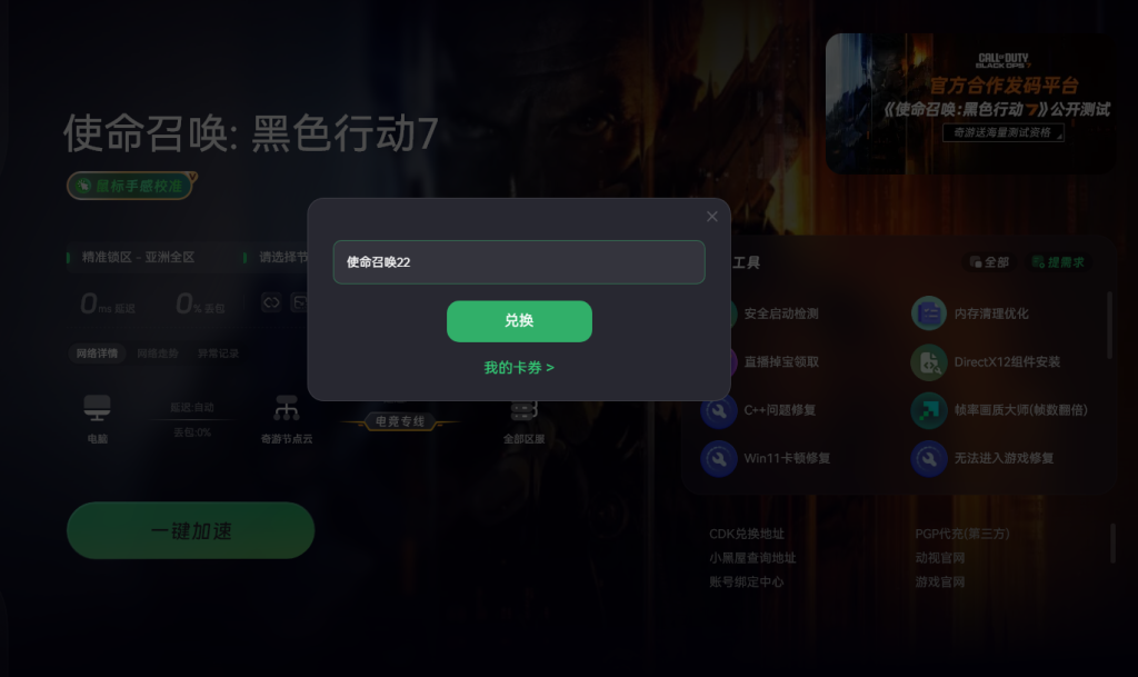 首先要准备好一款加速工具。在奇游加速工具的右上角口令输入处,输入使命召唤22,这样就能确保100%拿到一个激活CDK。