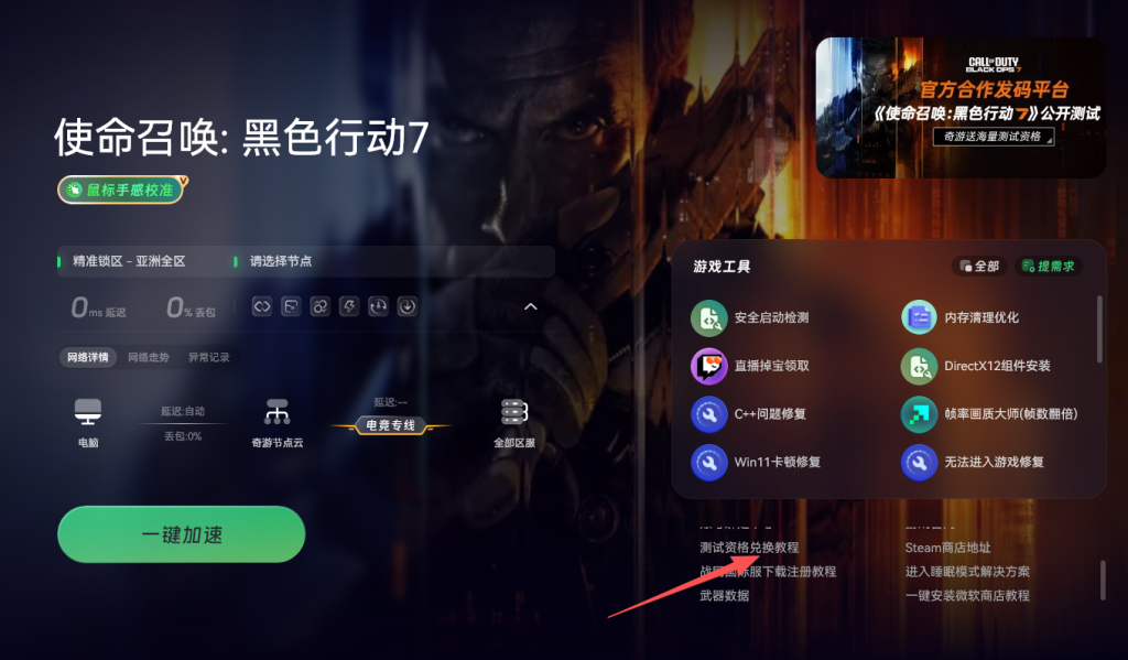 拿到CDK后在奇游加速工具中搜索cod22开启加速。加速完成后点击右侧的测试资格兑换教程,找到对应的兑换网址并进入。