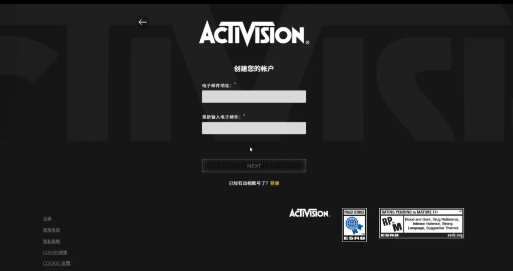 在兑换网址页面点击登录自己的动视账号。点击页面下方的注册按钮进行注册。注册时需准确输入成年的日期,选择合适的地区,接着输入自己的邮箱地址并确认,然后设置动视账号名称、姓名以及密码,完成注册流程。