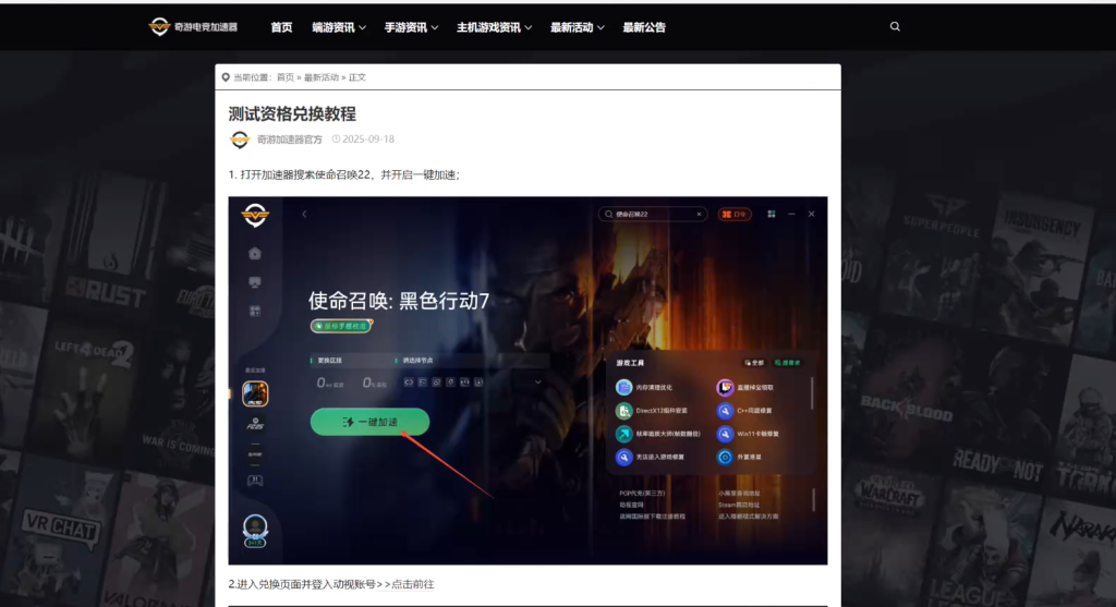 首先开启奇游加速工具,在工具界面中找到并点击兑换教程选项,随后进入相应的兑换网址页面。
