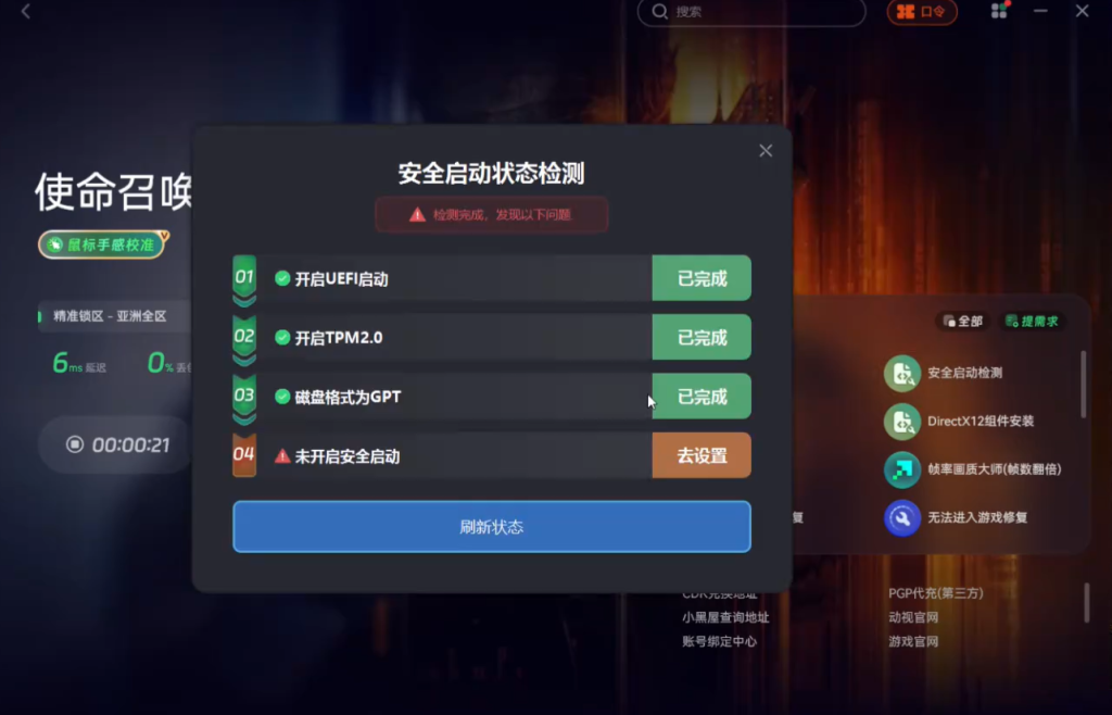 关于游戏下载需等待测试邮件发放,其中会包含详细的下载方法。或者也可以直接在Steam库中查找。不过由于游戏反作弊系统的升级,游玩使命召唤22时需开启安全启动,否则会出现secure boot报错。可以在奇游加速工具的右侧使用安全启动检测功能。