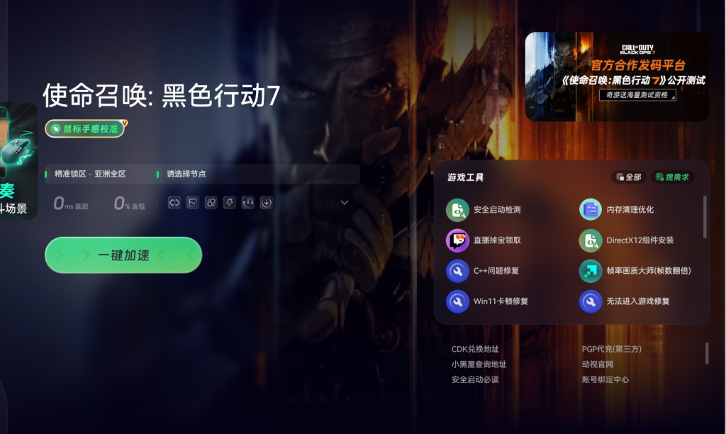奇游加速工具为大家开辟了快速获取测试资格的便捷通道,整个流程大约只需三分钟。首先,在奇游加速工具中搜索使命召唤:黑色行动开启加速。
