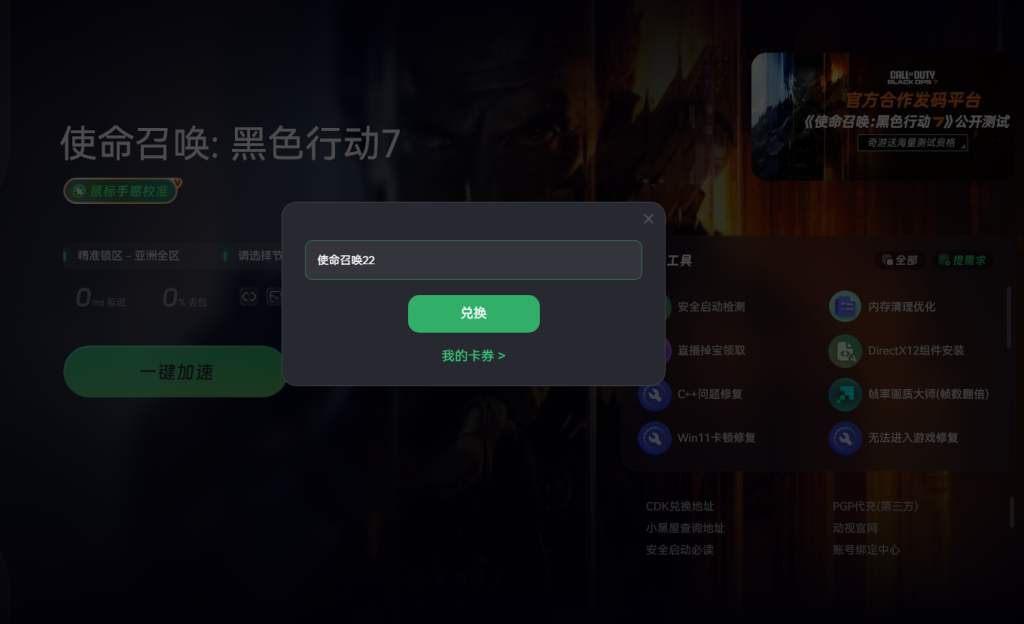 加速完成后在奇游界面右上角输入口令“使命召唤22”,即可领取一个专为COD22测试准备的CDK。