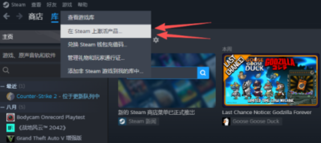 最后打开Steam平台,点击左上角的游戏菜单,在弹出的选项中选择在Steam上激活产品。在弹出的窗口中,输入之前获取的激活码,即可顺利完成测试资格的获取。
