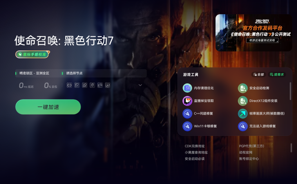 当下奇游与动视建立了正式合作关系,玩家借助奇游就能免费获得测试资格。开启奇游加速工具,在工具右上角的显眼位置找到口令兑换入口。进入后输入使命召唤这四个字,即可领取到一个测试激活码,同时还会额外获得一些加速时长。