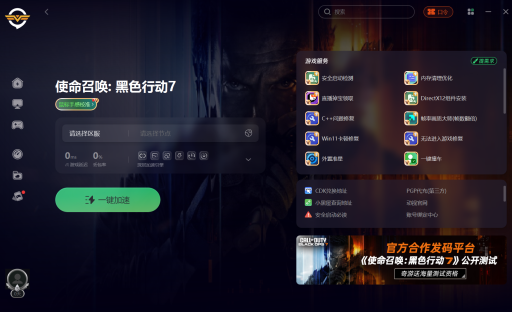 首先,利用奇游加速器优化网络,解决卡登录与转圈问题。游戏服务器多位于海外,国内玩家易因网络链路拥堵、数据丢包出现登录加载故障,而奇游加速器的专线技术可针对性解决这一问题。具体操作如下:第一步,下载并安装奇游加速器,打开后搜索 “使命召唤黑色行动 7”;第二步,根据自身使用的 Steam 或战网平台选择对应区服,点击 “立即加速”,加速器会自动匹配低负载、低丢包的最优节点;第三步,加速完成后从加速器内启动游戏,多数因网络延迟引发的登录卡住、转圈问题可快速缓解。此外,在加速器右上角输入专属口令 qy666,可领取 3 天会员。