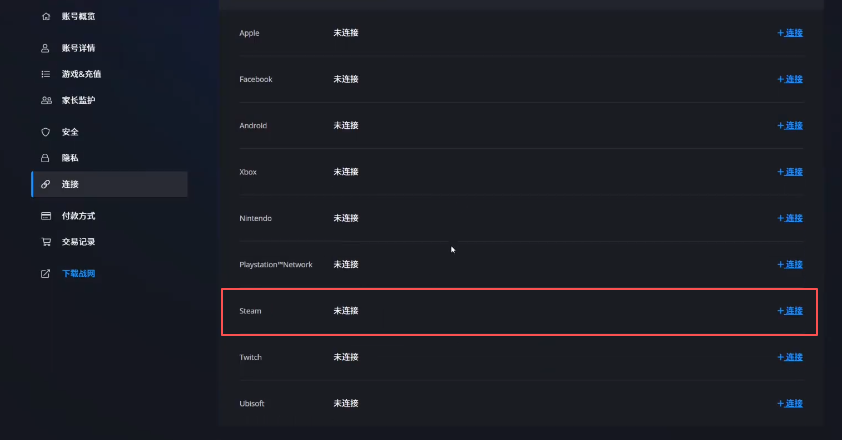 注册成功之后,最后一步是绑定Steam。回到战网账号的页面,在左侧菜单里找到“连接”之类的选项,然后往下翻,找到Steam的图标。