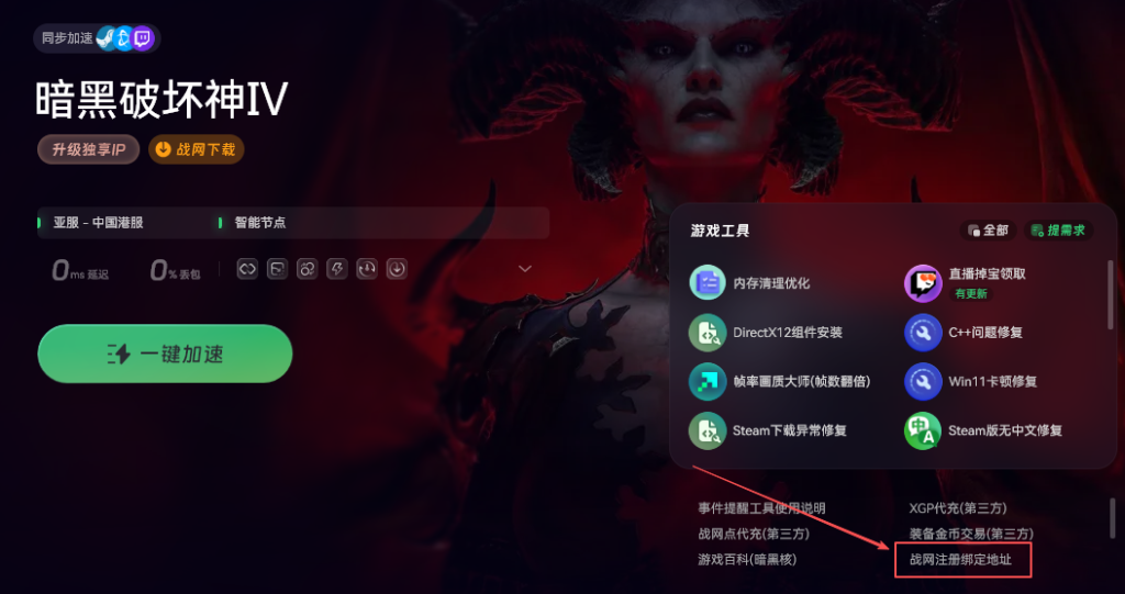 首先打开奇游加速工具,在里面搜索“暗黑四”进行加速。加速前记得把节点选成“港服”,然后在加速设置里,把模式改成“路由”模式。这一步主要是为了防止接下来打开网页时,系统又自动给你跳转到国服去。