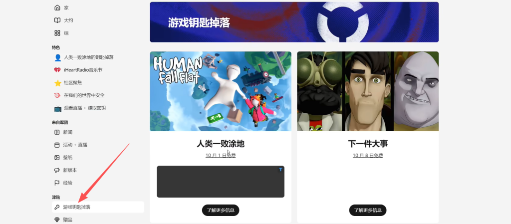 点进去之后会发现,页面已经调整为锁国区状态,这时候别直接点领取。注意看左边有一个“游戏钥匙掉落”的选项,点进去就能看到《人类一败涂地》的领取倒计时,活动会在10月2日凌晨一点正式开始。
