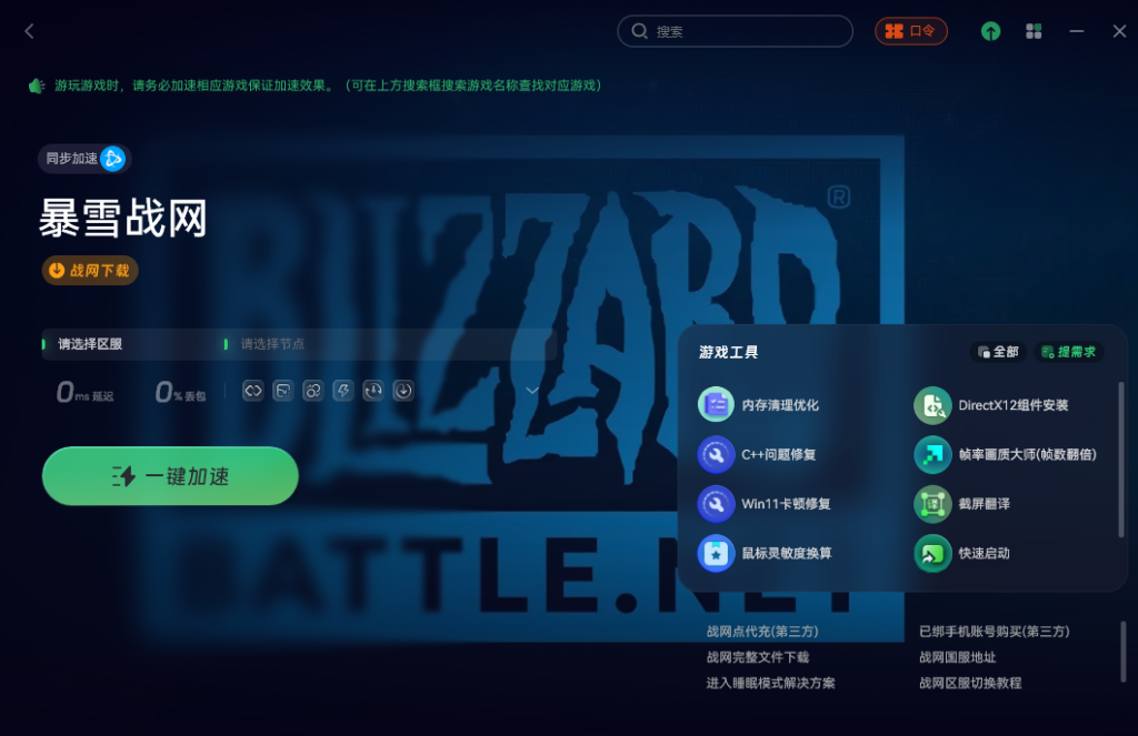 开始之前,建议大家先准备好网络环境。因为战网国际服和Steam平台都对网络连接有比较严格的限制,如果直接操作,可能会遇到卡顿或者连不上的情况。打开奇游加速工具,对战网国际服进行节点加速,这样后面绑定会更顺利。