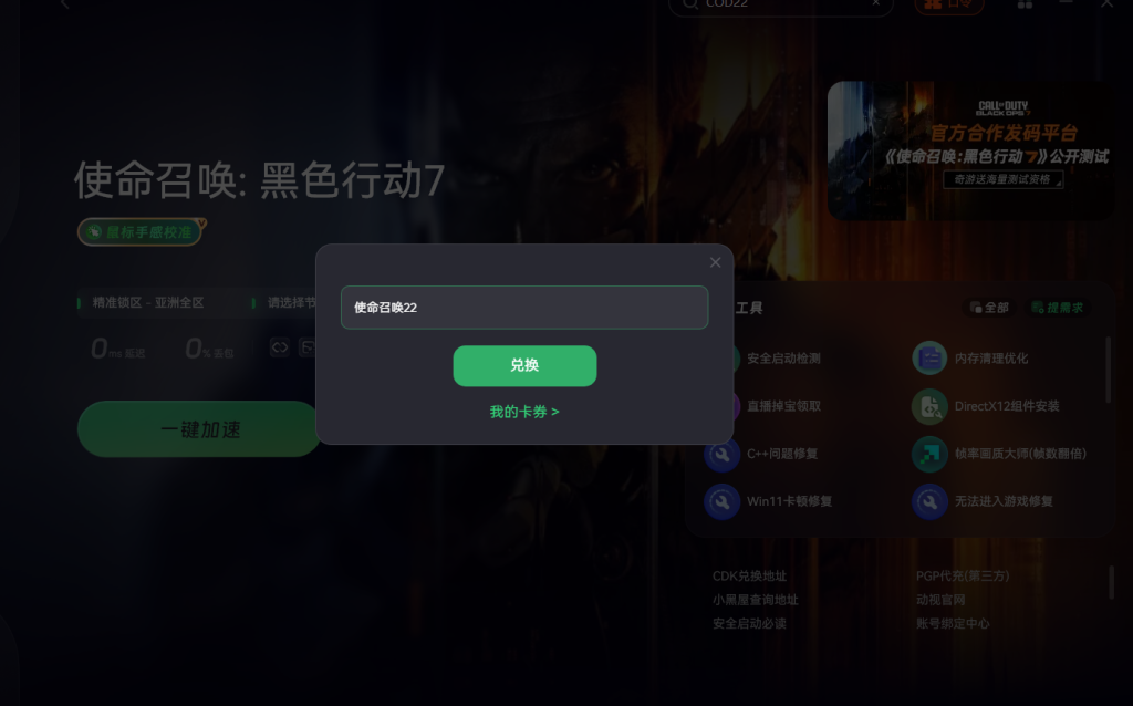 首先大家可以借助奇游加速工具来获取测试码,在奇游加速工具里准确输入口令cod22资格,就有机会成功获取测试码,各位玩家不妨都尝试一下。在成功取得测试码之后,需要前往使命召唤的官方网站进行测试资格的兑换操作。