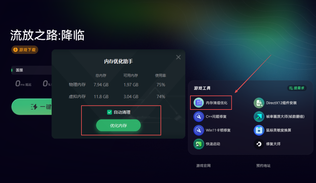加速之后,再点一下界面里的“内存清理”功能,建议把“自动清理”勾选上,让它帮你优化一下。这样一般能有效降低内存占用,游戏就不那么容易闪退了。