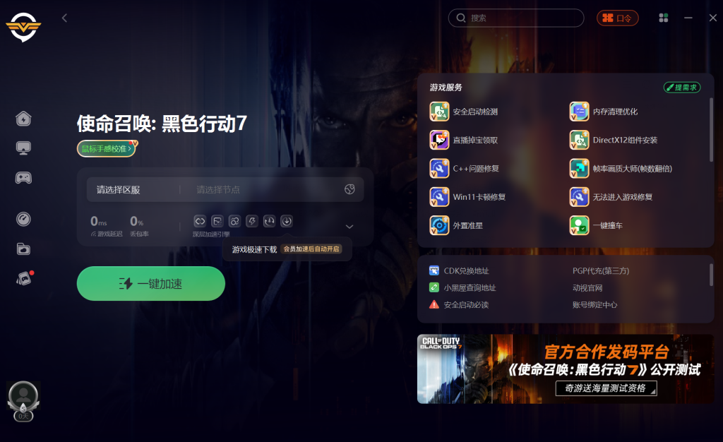 首先,使用奇游加速器优化网络,可解决八成网络类报错。像 “连接服务器失败”“COD-SERVER-ERROR” 这类错误,多因跨区网络不稳定导致。奇游加速器的专线优化功能能针对性解决该问题,具体操作分两步:一是下载安装奇游加速器,搜索 “使命召唤黑色行动 7” 并选择对应的 Steam 或战网平台;二是挑选延迟低于 50 毫秒的区服节点,点击 “立即加速”,加速器会自动修复数据传输链路。输入专属口令 qy666,还可领取 3 天会员。