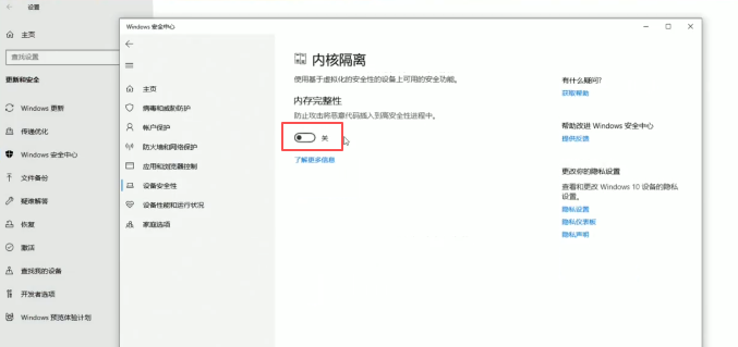 如果提示还在,我们可以试试关闭系统里的一个安全功能。打开“Windows安全中心”,进入“设备安全性”,找到“核心隔离”详情,把里面的“内存完整性”这个开关关掉,然后重启电脑。
