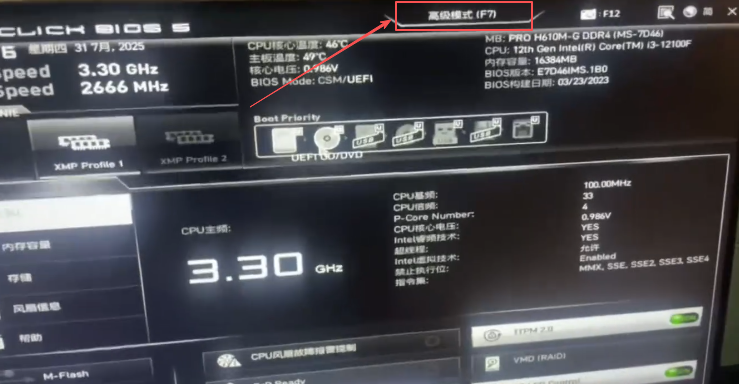 第二步,就是进入主板的BIOS设置里把它打开。不同的电脑进入BIOS的按键不太一样,一般是开机时狂按 Delete 或 F2 键。进入BIOS后,按 F7 切换到“高级模式”,找到并点击“OC”(超频设置)选项。
