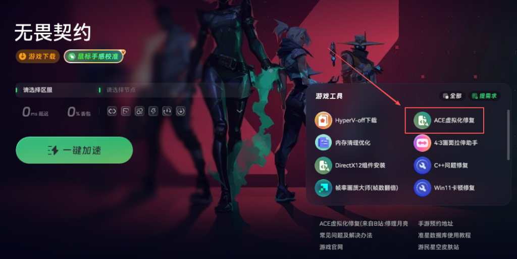 如果试遍了以上所有方法,错误提示依然很顽固,那我们可以借助一些网络加速和修复工具。打开奇游加速工具,搜索“无畏契约”进行一键加速。