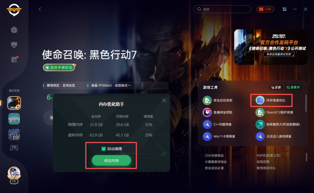 然后游戏闪退崩溃主要是内存导致的,我们点击奇游右侧的内存清理优化,并勾选自动清理优化内存,即可一键清理内存哦,这样可以有效改善闪退奔溃的问题。
